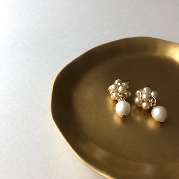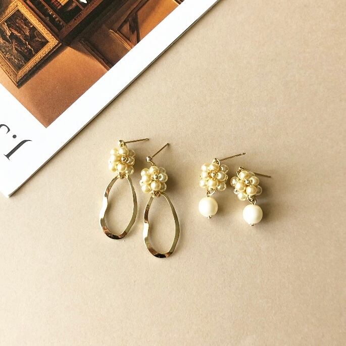 ライトイエローパールのビーズボールにシルクホワイトのパールを合わせた小さなイヤーアクセサリーです。